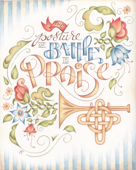 Years later, when Susan was poked, she bled praise. She suffered a stroke in her 40s and I have never heard her utter a bitter word about it. After seeing Susan last June, I asked another friend, Jennifer Trafton Peterson, to make this custom artwork for her. The words are ones I have heard Susan say many times.