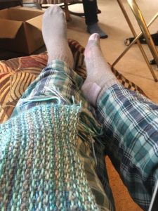 My left ankle aches. The bruising from my knee injury is draining to my feet. I asked a doctor about it — the husband of a friend — at a swim meet because I didn’t want to make a trip to the clinic. He said it was normal. It looks awful but no one sees my ankles, and I can live with the ache. But I prop my leg up like an old woman, and I guess I am.