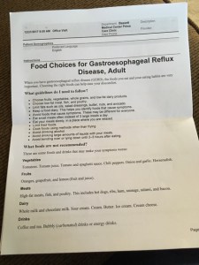 Finally, she sent me on my way with a follow-up appointment scheduled, information about Gastro-Esophageal Reflux Disease which included dos and don’ts, and a prescription.