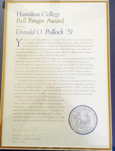 He went on the mention my father receiving the Bell Ringer Award, one of Hamilton’s highest honors. Dad has that award framed and hanging in the dining room.