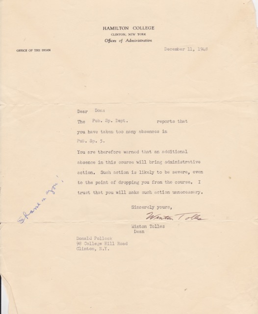 So, for Uncle Stewart, I include one last Hamilton College letter that my father has saved for 70 years. It was in the same folder as the Glen Cunningham letter, and was written by Winton Tolles, Dean.