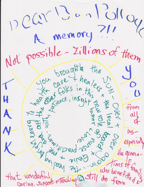 Dr. Pollock has been a sincere, caring teacher, believing in talking and listening to patients, showing us the small, redeeming acts of mercy. He reminded us to listen to our patients. He honored the shimmering mystery of what we are even when in pain, even as life leaks away. Remember the awe, the sense of being in the presence of something greater than oneself. Be a part of the healing.