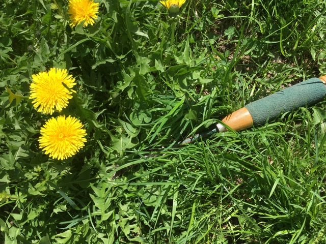 I grabbed the crumpled papers and marched out to my father who was still standing on the deck holding the dandelion-stabber and looking at the dandelions.