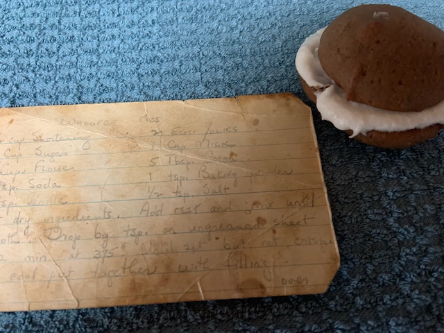 “I had to look through three boxes of recipes before I found this one,” Mary said, showing me the old hand-written recipe which my mother had labeled “Whoopee Pies.”