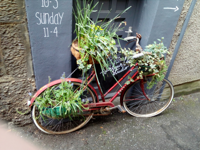 She washed her hands and stepped out the door. Her bike was covered with flowers, all her favorite kinds.