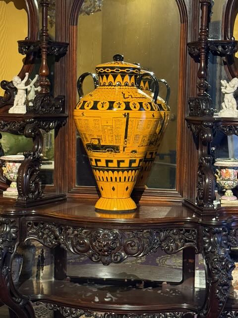 I took this photo today at the Munson Art Museum in Utica, NY. It made me laugh. Part of the museum is in an old Victorian house, with rooms staged with antiques, roped off with those red-velveted cords. Anyway, in one room full of glorious ornate pieces of furniture and statues and artwork, there was this yellow vase with a truck on it. Here’s the card that explains it:
