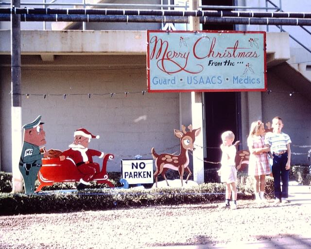 Is this a juxaposition photo? I dunno. I thought it was funny — kids waiting to see Santa who’s getting a parking ticket from the military police. (circa 1964)