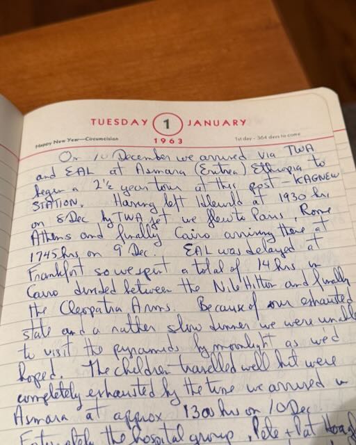 “On 10 December we arrived via TWA and EAL at Asmara (Eritrea) Ethiopia to begin a 2 1/2 year tour at this post — KAGNEW STATION. Having left Idlewild at 1930 hrs on 8 Dec by TWA jet we flew to Paris, Rome, Athens, and finally Cairo arriving there at 1745 hrs on 9 Dec. EAL was delayed at Frankfort so we spent a total of 14 hrs in Cairo divided between the Nile Hilton and finally the Cleopatra Arms. Because of our exhausted state and a rather slow dinner we were unable to visit the pyramids by moonlight as we’d hoped. The children travelled well but were completely exhausted by the time we arrived in Asmara at approx 1300 hrs on 10 Dec …”