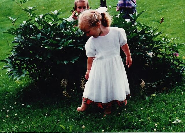 This is my oldest daughter wearing my old dress. (And one of her brothers photo-bombing)