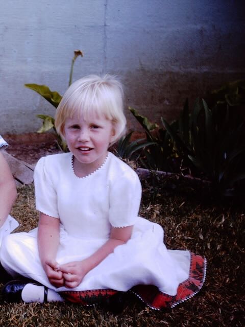 This is my oldest daughter wearing my old dress. (And one of her brothers photo-bombing)