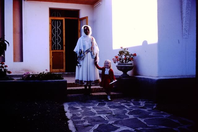 This is Gazachen, our housemaid, dressed in the shawl and white gauzy dress, and me, not to be trusted in a white dress.