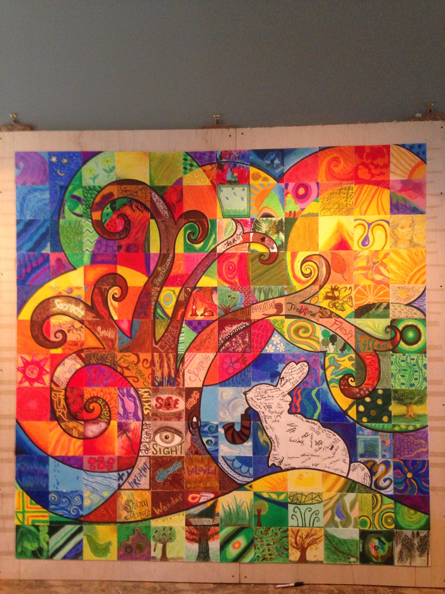 Each person got a random square with some pre-drawn lines on it and a color palette for those lines. Some squares also asked the artist to write a word that had been meaningful to them that weekend. People creatively filled the square. Then, while we were in our last session, sharing and finally singing the Doxology, little elves were assembling those squares into a great picture.