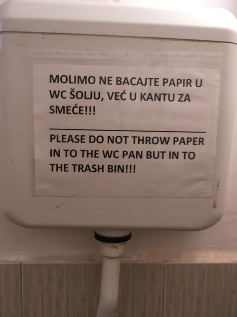 Molimo ne bacajte papir u wc šolju, već u kantu za smeće translates to Please do not throw paper in the toilet, already in a garbage can (GT: Bosnian to English) Not bad, really.