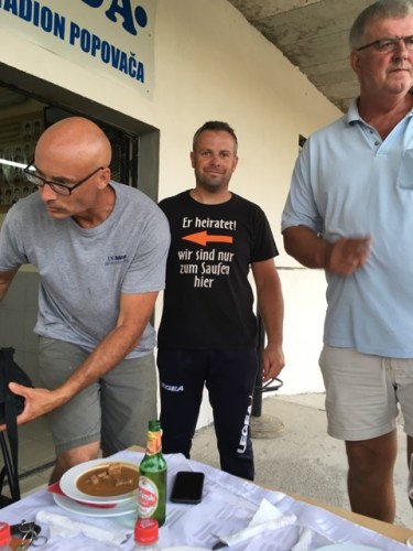 I have no idea what the guy thought when I snapped this picture. This was after the soccer game (fudbalski) — and it looked like one of those “I’m with Stupid” shirts.
