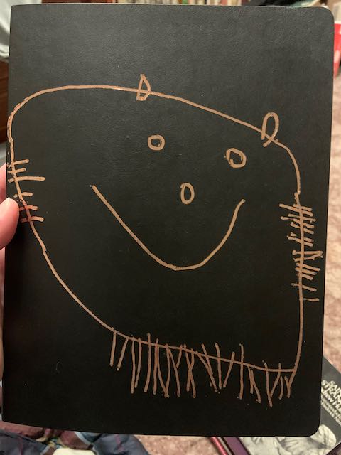 I started practicing 23 word cohesive writing in my new journal from my granddaughter — well, technically it’s from my son who drew my name in our family gift exchange. He knows what I like, though, so he made her a part of it. (That’s a cat that she drew on the cover of the journal.)