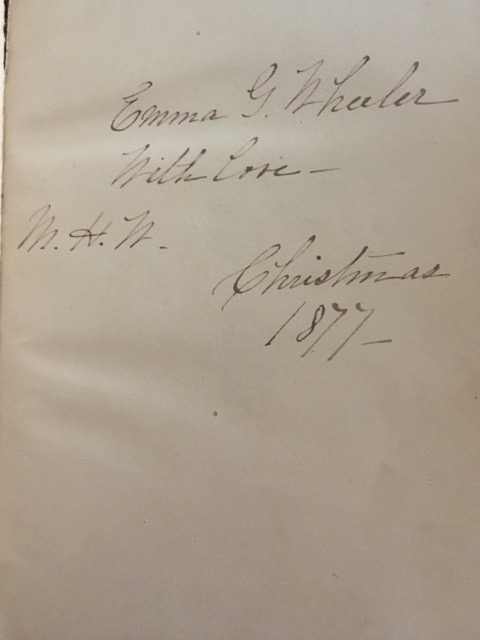 - Inscription — I’m a sucker for inscriptions, especially really old ones. 140 years ago, MHW suspected that Emma would love the poems inside and gave her the book for Christmas. She held it in her hands and leafed through it, knowing she would come back to some of the poems over and over again.
