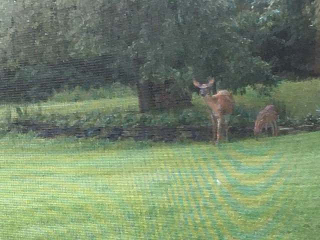 A doe and her fawn nibbled grass outside the window. I wished I had washed the windows or not had the screen in.
