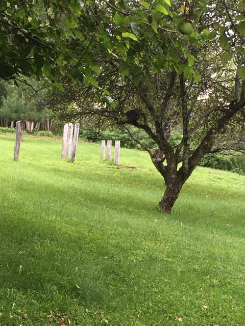 Later in the day, I saw him trekking across the backyard and into the orchard. He picked a dwarf apple tree and climbed it.